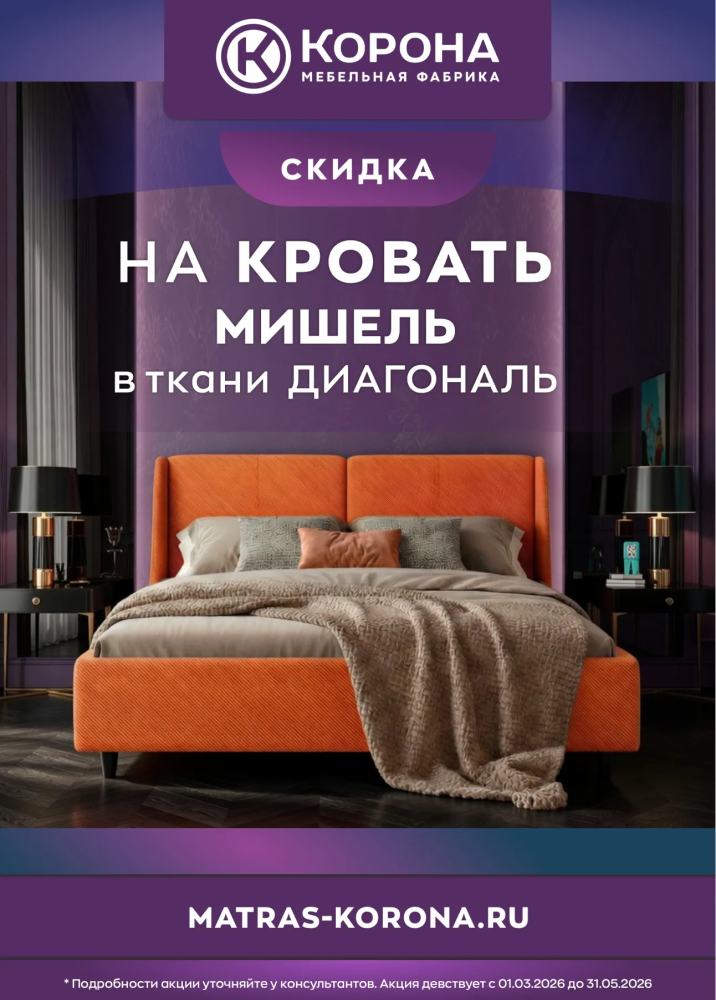 Только в фирменных магазинах фабрики «Корона» стартовала эксклюзивная акция на интерьерную кровать «Мишель» в потрясающем исполнении — премиальной ткани велюр «Диагональ».